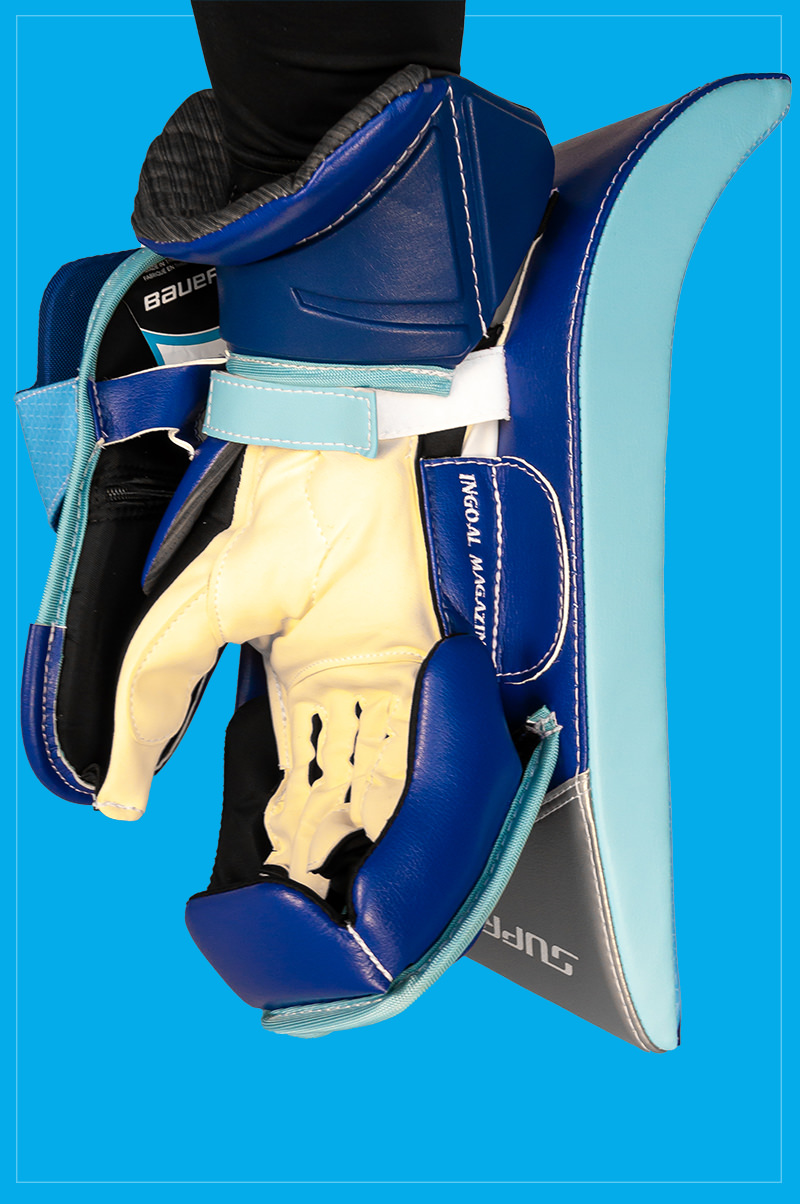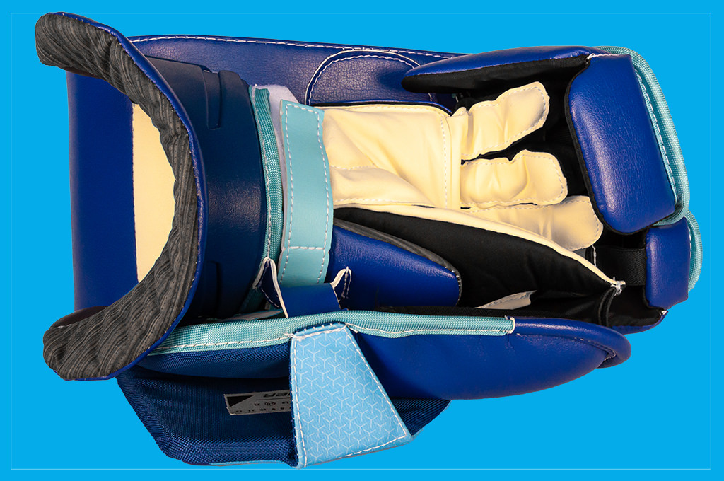 Bauer also thankfully got rid of another area of needless extra material: the thick band that ran from the base of the inner thumb protection to the outside of the wrist on previous models. All it seemed to do was add potential interference with wrist mobility, which was further enhanced in the UltraSonic blocker by attaching the molded (and very open) cuff to the board with short elastics on each side, an option that used to only be available to pro goaltenders, and one that adds even more range of motion to accurately steer those active rebounds away from danger.