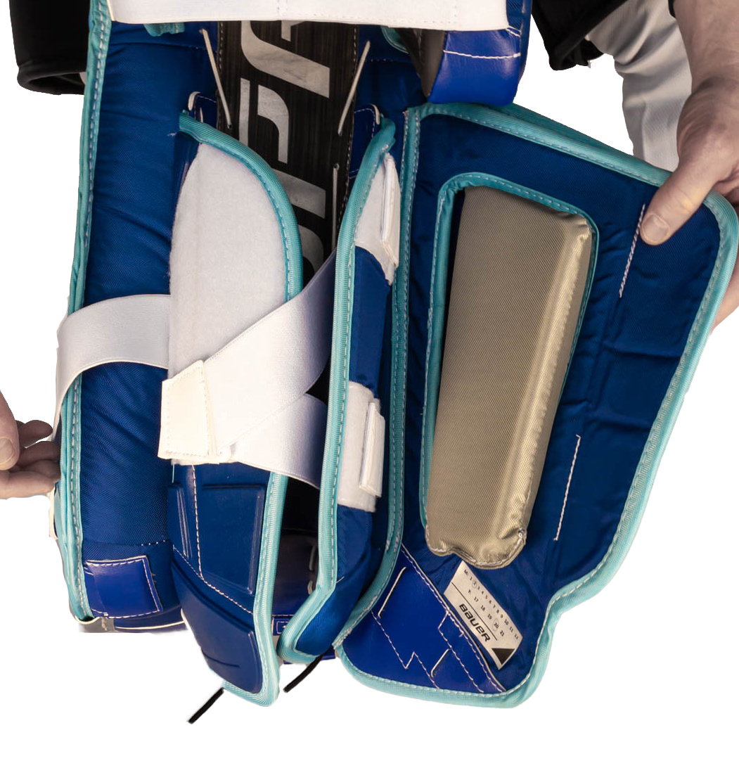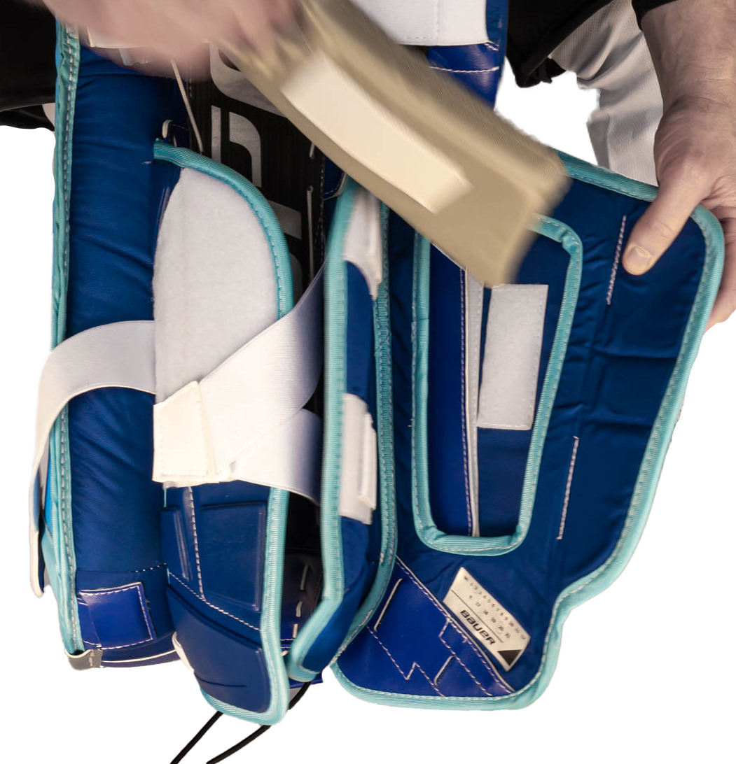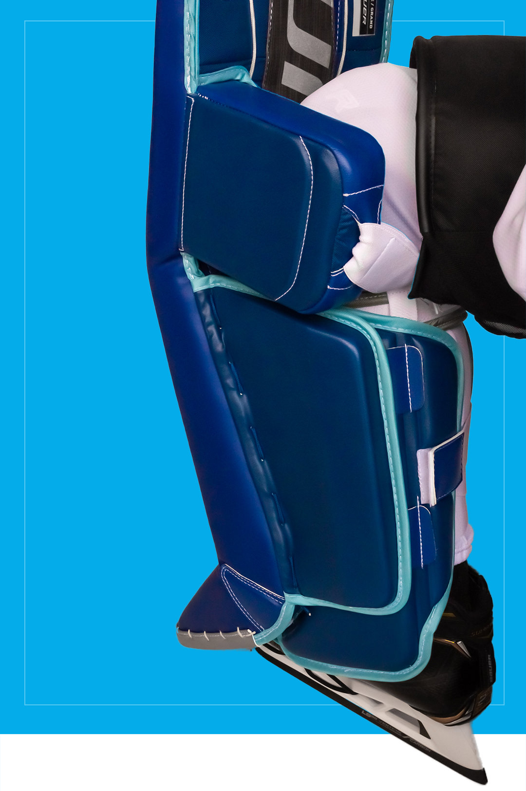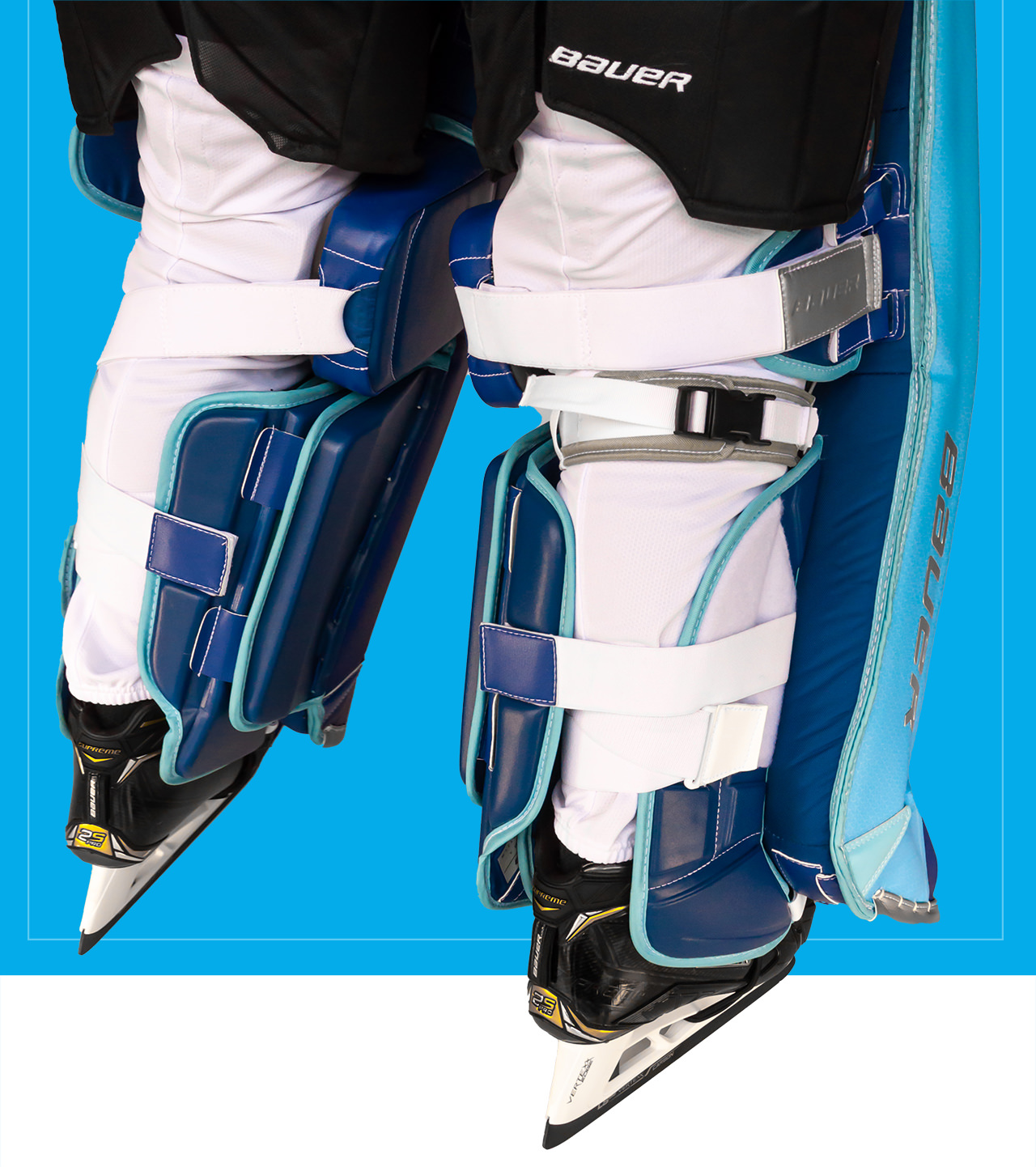Rounding out the strapping is the continued use of the elastic-and-Velcro toe tie system that debuted on the Vapor 2X Pro pad, and comes in offset position towards the inside edge (it can be custom ordered in a centered position). This bungee-style system, which has become popular across most brands, has enough flex for the skate to easily get to the ice while down in the butterfly (again, making it easier to grab a push edge from your knees), but the elasticity helps pull and rotate the pad back over the middle of the skate when the goalie gets back up. In other words, it enhances that connected feeling, providing the range of motion goaltender used to achieve by tying knots into their lace toe ties without adding the sloppiness of that gap.