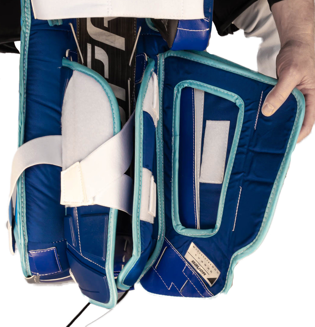 Like previous models, this elastic knee strap is double thick in the middle so it won’t stretch out too easily, and can be attached either down on the outer calf wrap (as Carey Price first did to start that trend), or wrapped around the knee to an outer flap that is not only easily removable with small Velcro tabs, but can also be angled or inset more with two attachment points.