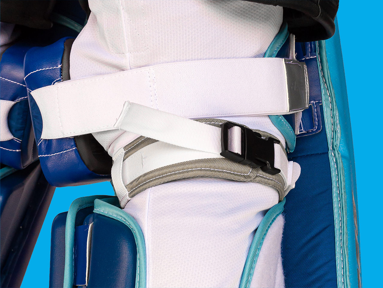 The other big addition to the new Supreme UltraSonic pad is called a Tune Fit Connect strap, but most will recognize it by the more generic name, a “professor strap.” Bauer made this strap, which sits at the top of the calf and can help keep the leg from moving too far away from the knee stack, easily removable with Velcro tabs on either side of the leg channel, and easily adjustable with a combination of Velcro and a nylon strap with a plastic clip.