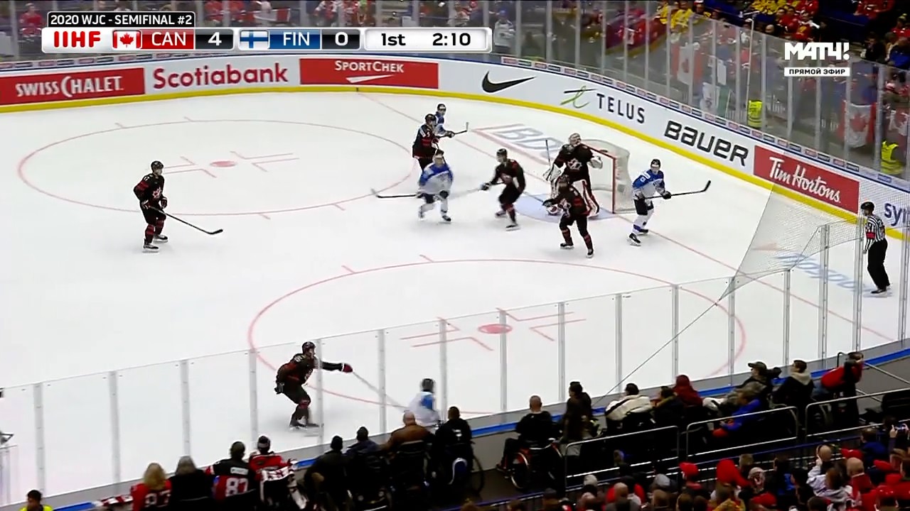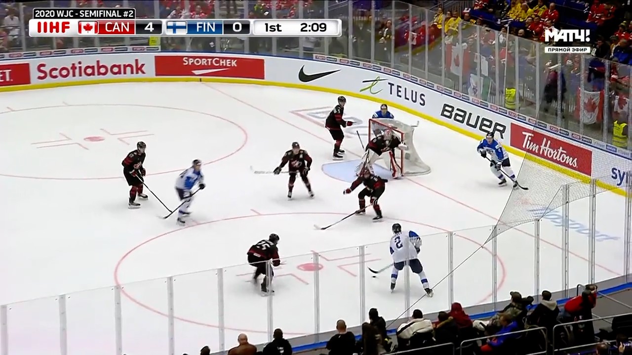 This play starts in the Canadian zone and a seemingly harmless 5-on-5 situation, but things change quickly after the Finnish defenseman on the right side eludes a check coming down the wall near the top of the faceoff circle and starts to attack towards the dot. Fortunately for Canada, Hofer takes a snapshot of the options while this play was higher the zone: