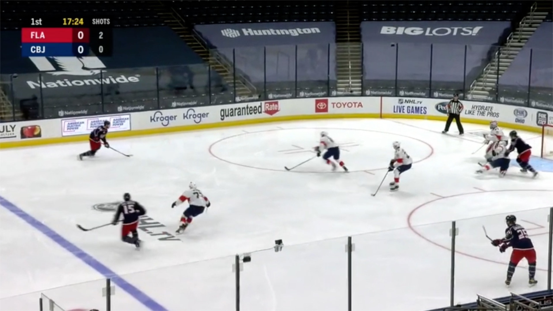 This starts as a relatively routine five-on-five in-zone play against the Columbus Blue Jackets earlier this season, with the puck moved up to the point and a battle for position in front:​