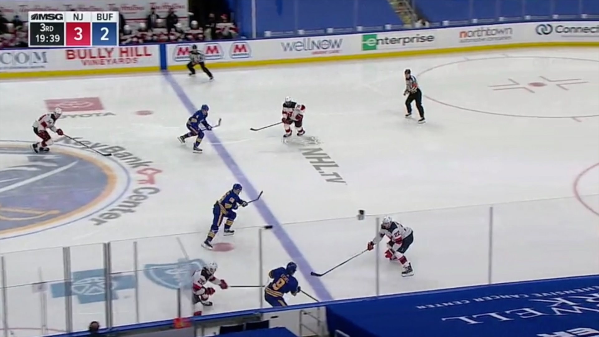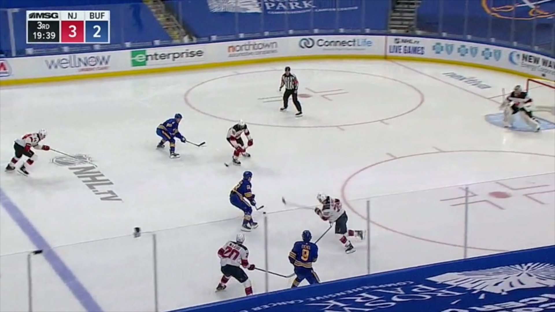 Comrie is facing a 3-on-2 rush as the Sabres gain the blue line with Jack Eichel carrying the puck down the right wing and Taylor Hall streaking down the opposite side.