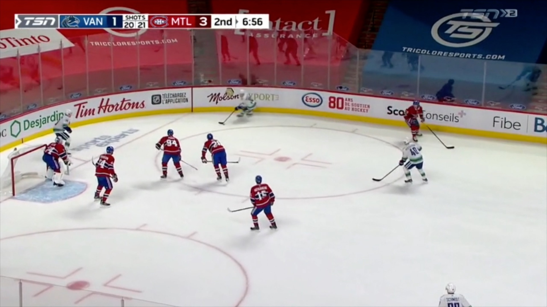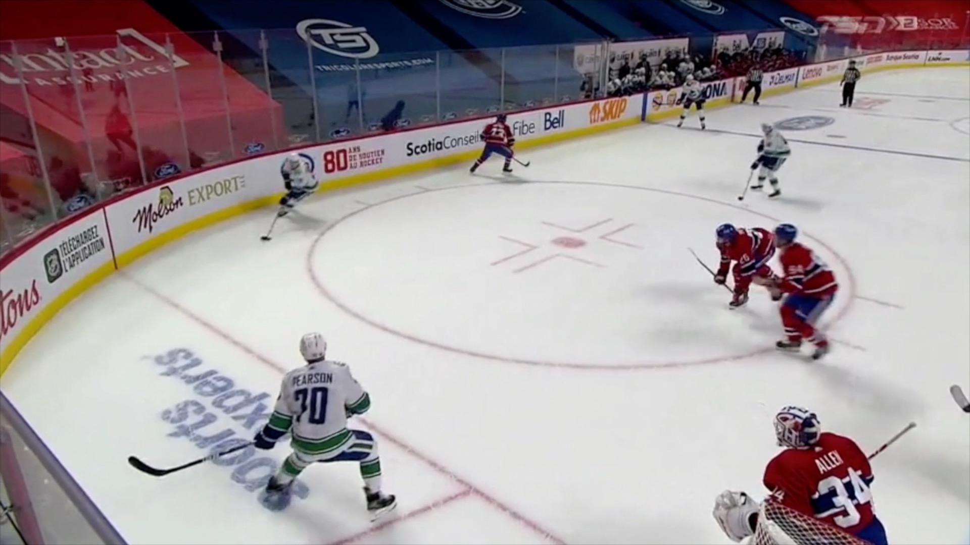 Allen is at home in Montreal against the visiting Vancouver Canucks for this chance, which starts with a turnover in the Canadiens end and a point shot that fells his defenseman Jeff Petry and creates a quick sharp angle attack with a down low pass option for Nils Hoglander.
