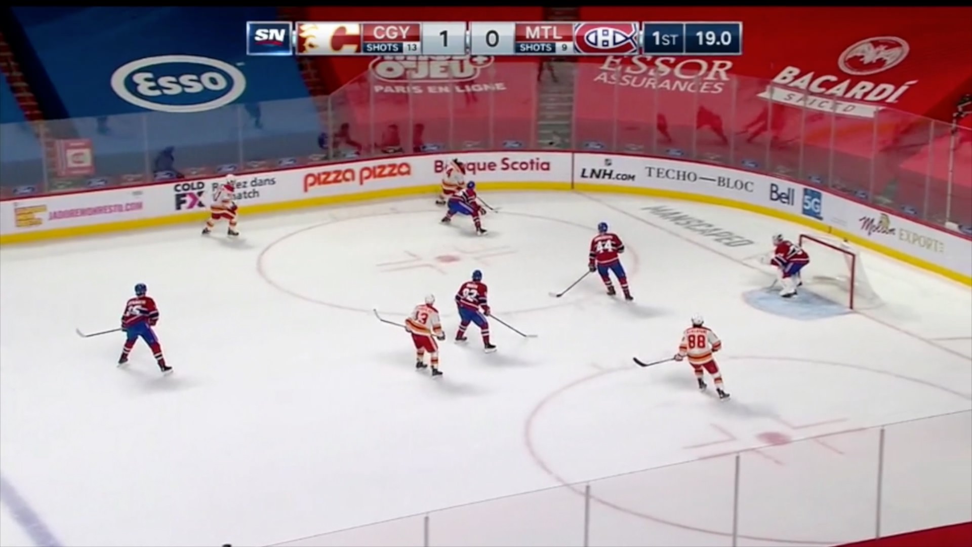 As the play gets deeper into the zone, the situation changes, with Flames defenseman Rasmus Andersson up in the rush but in a relatively harmless position in the corner? Taking a look at this freeze frame below, who is the most dangerous player on the ice at this point?