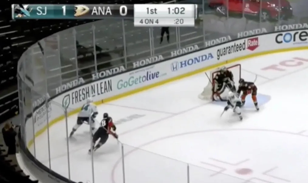 It’s probably not a surprise to see Miller on his feet still in the freeze frame above. After all, Vlasic isn’t really a threat to score from below the goal line, but things change for Miller in the image below as Vlasic continues on his path towards the back of the net: