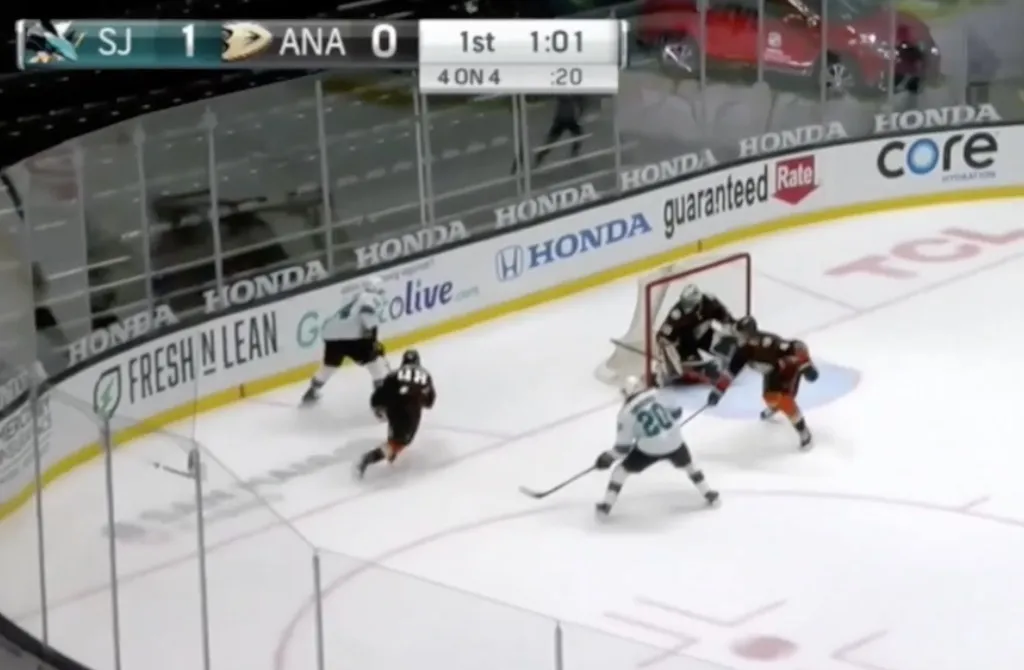 This chance against the San Jose Sharks comes during 4-on-4 play and starts with defensemen (Marc-Édouard Vlasic) receiving the puck in the corner and carrying it below the goal line: