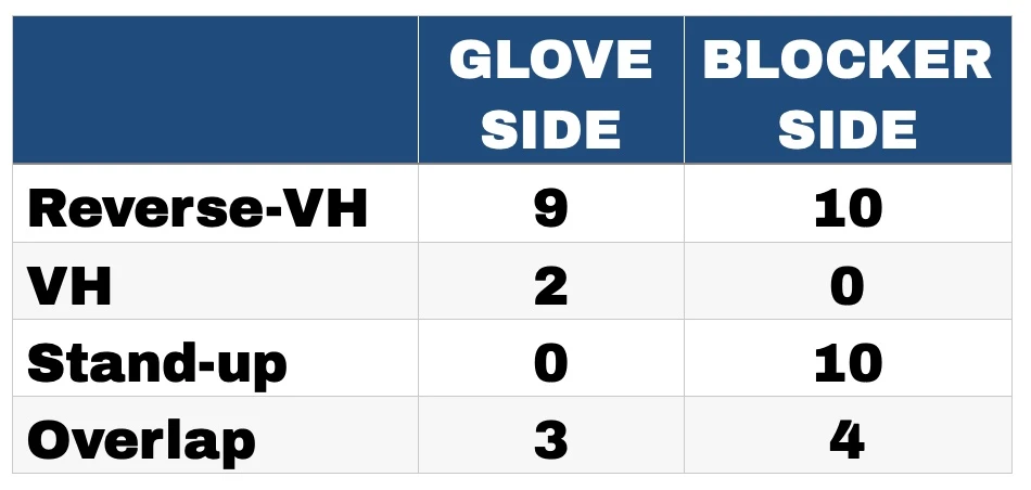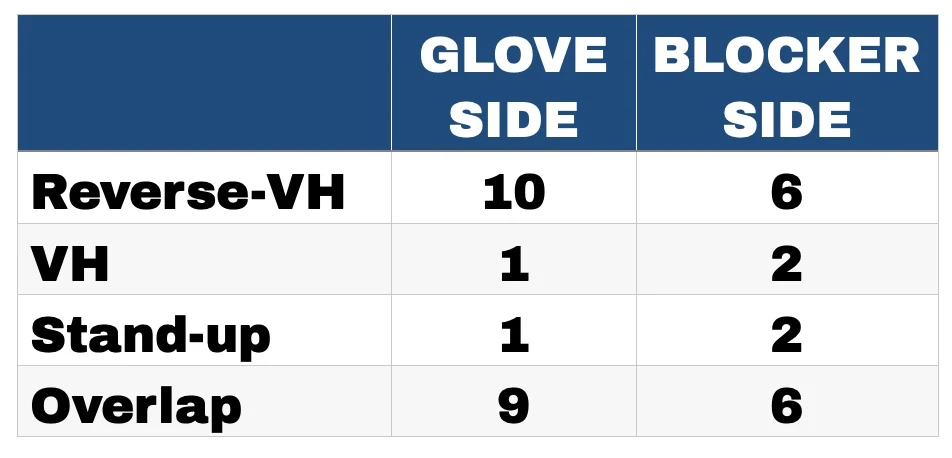 As you can see in the first example against the Winnipeg Jets, Fleury mixed in a reverse-VH when the play was originating from behind the net, and that factors into the majority of his decisions to use reverse-VH. For comparison’s sake, we took a look at 38 chances from the season before with Vegas, and it’s jarring how frequently Fleury simply “stood up.”