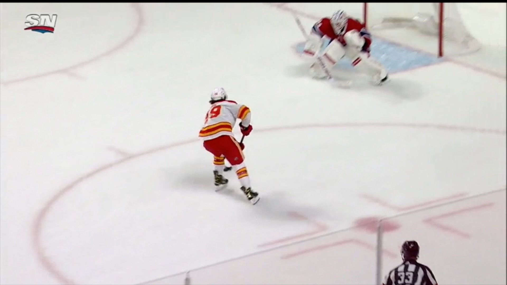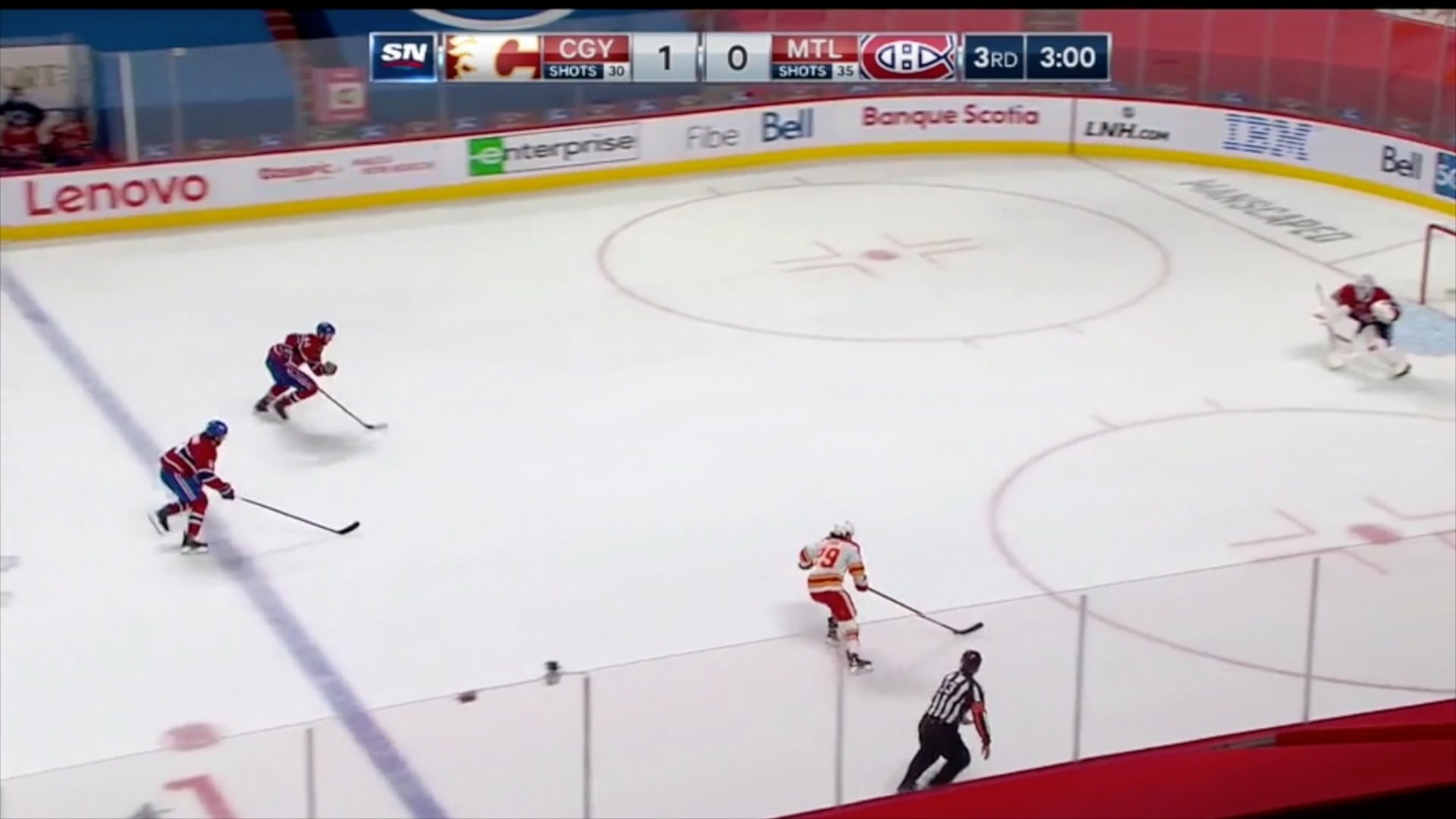 Allen is facing a breakaway by Calgary Flames forward Dillon Dube with three minutes left in a game the Canadiens are trailing 1-0, so this is an important save to keep them in the game.