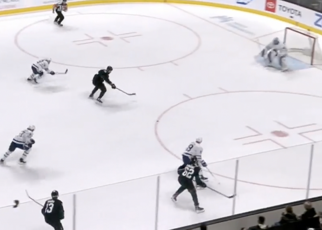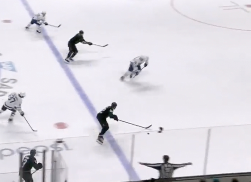 This time Woll is facing the San Jose Sharks in a game that ended with him stopping 34 of 35 shots, including the result of this regroup attack that starts just outside the Toronto blue line and quickly becomes a 2-on-1. The question is whether it will finish as a 2-on-1, so looking at the Sharks forwards as they enter the zone below, what clues are you looking for?