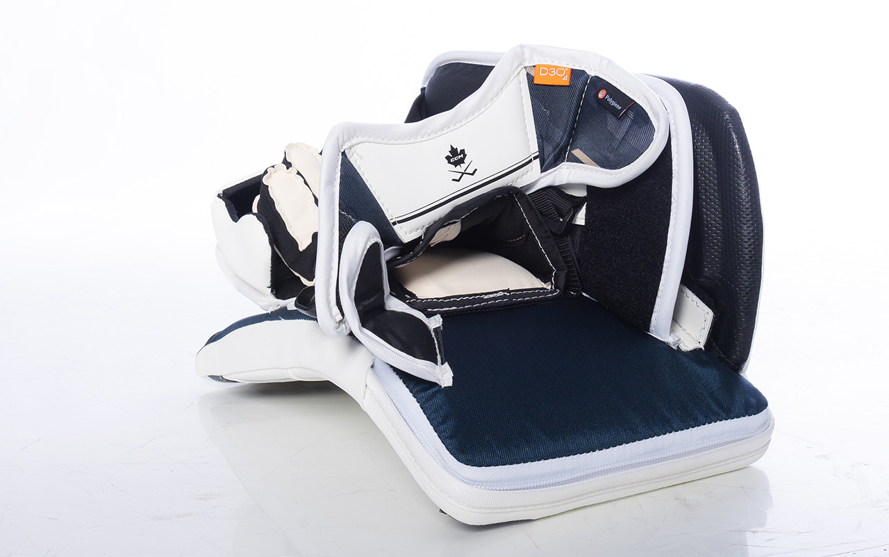 CCM fixed the inner flap of the new knee stack to the inner edge of the pad, and then attached that to the re-designed one-piece knee block that sits atop it with Velcro flaps on either side, ensuring this new knee stack won’t get as floppy as its predecessors over time, which allows the goalie to drive the entire pad the ice faster, without any lag between the knee and the face.