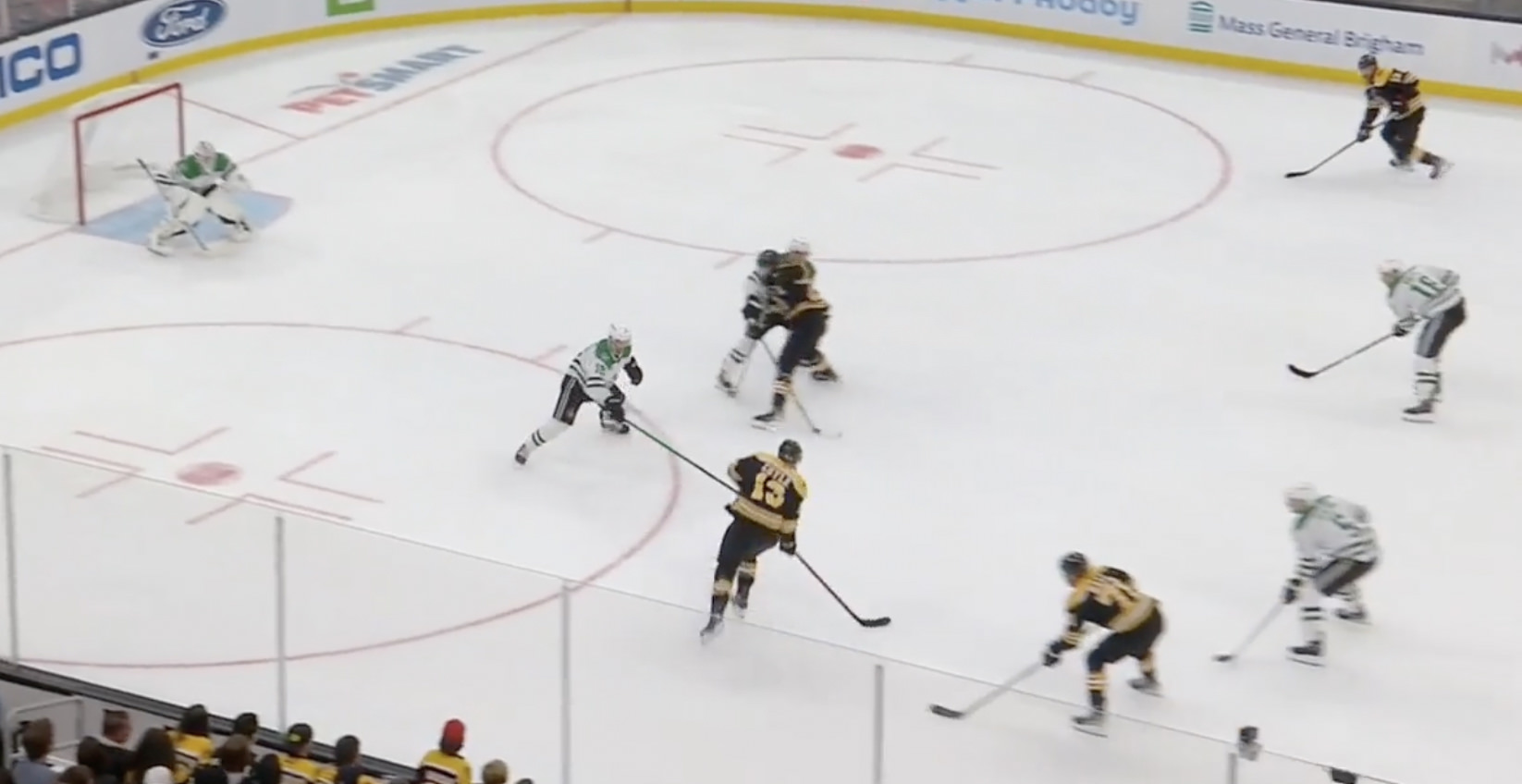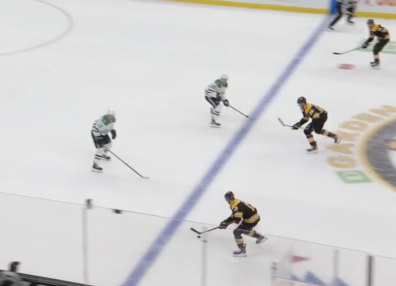This 3-on-2 against the Boston Bruins developed early at the far blue line so by the time they hit the Stars end in the freeze frame above, Holtby has had plenty of time to gather the information he deems most important. What details would you be looking for?