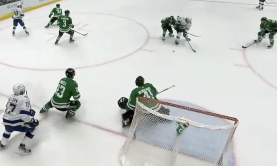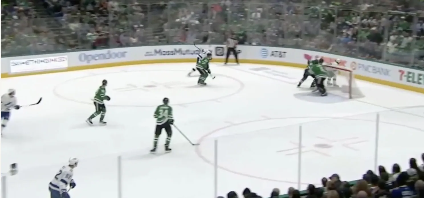 Like his Pro Reads debut, Wedgewood is again facing his former team, the Tampa Bay Lightning but instead of a power play, this time the teams are 5-on-5 in the Dallas defensive zone: