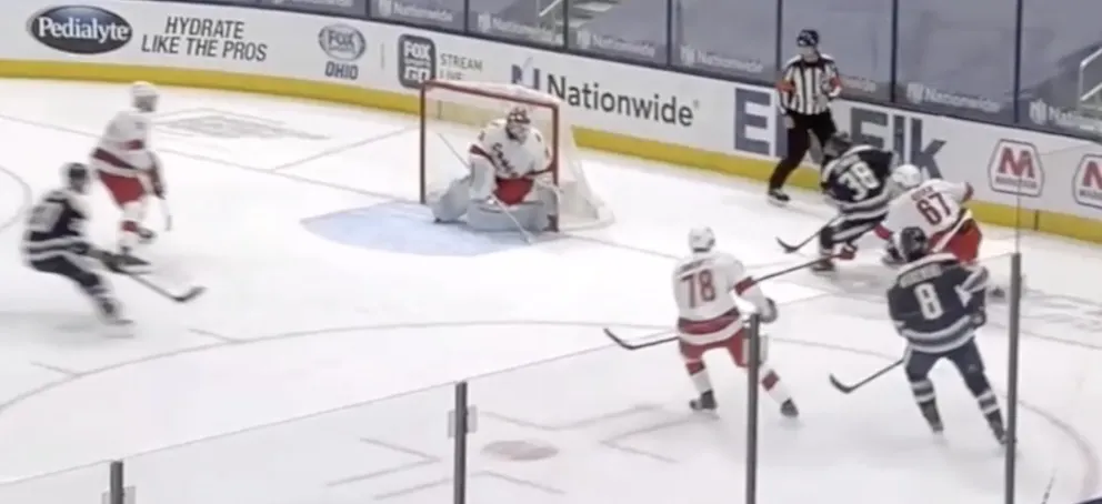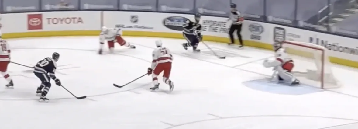 In this sequence Nedeljkovic deals with a couple of sharp-angle attacks against the Columbus Blue Jackets – one from above the goal line and another after being forced to go side to side on a play below it – which was a perfect chance to expand on his post play evolution.