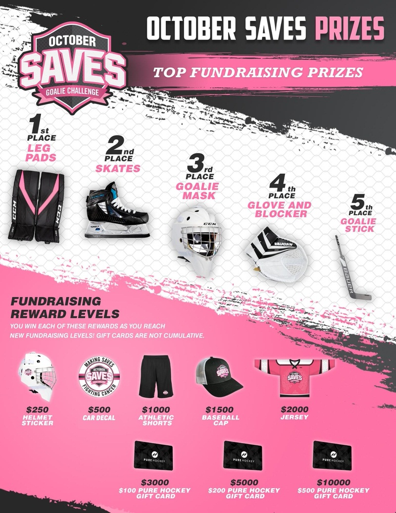 October Saves is an all-volunteer 501(c)(3) charitable organization that began in 2014 for the purpose of raising money to fight cancer. The concept is simple. During Breast Cancer Awareness month, goalies of all ages and skill levels across North America gather pledges for each save they make during October. Funds raised benefit our amazing cancer-fighting beneficiaries across the US and Canada and goalies win prizes as they raise money!