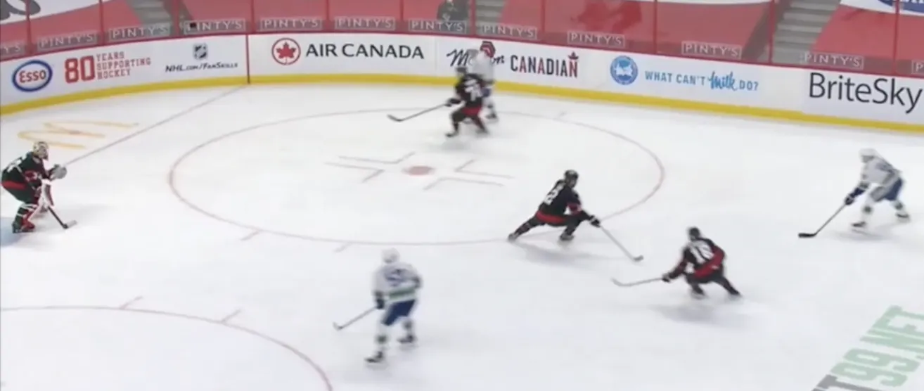 Things look a lot different as the Senators get mixed up in their defensive zone coverage, with two players attacking the puck carrier and leaving a wide-open option behind them. Looking at the freeze frame shot above, what information is most important to reading this attack?
