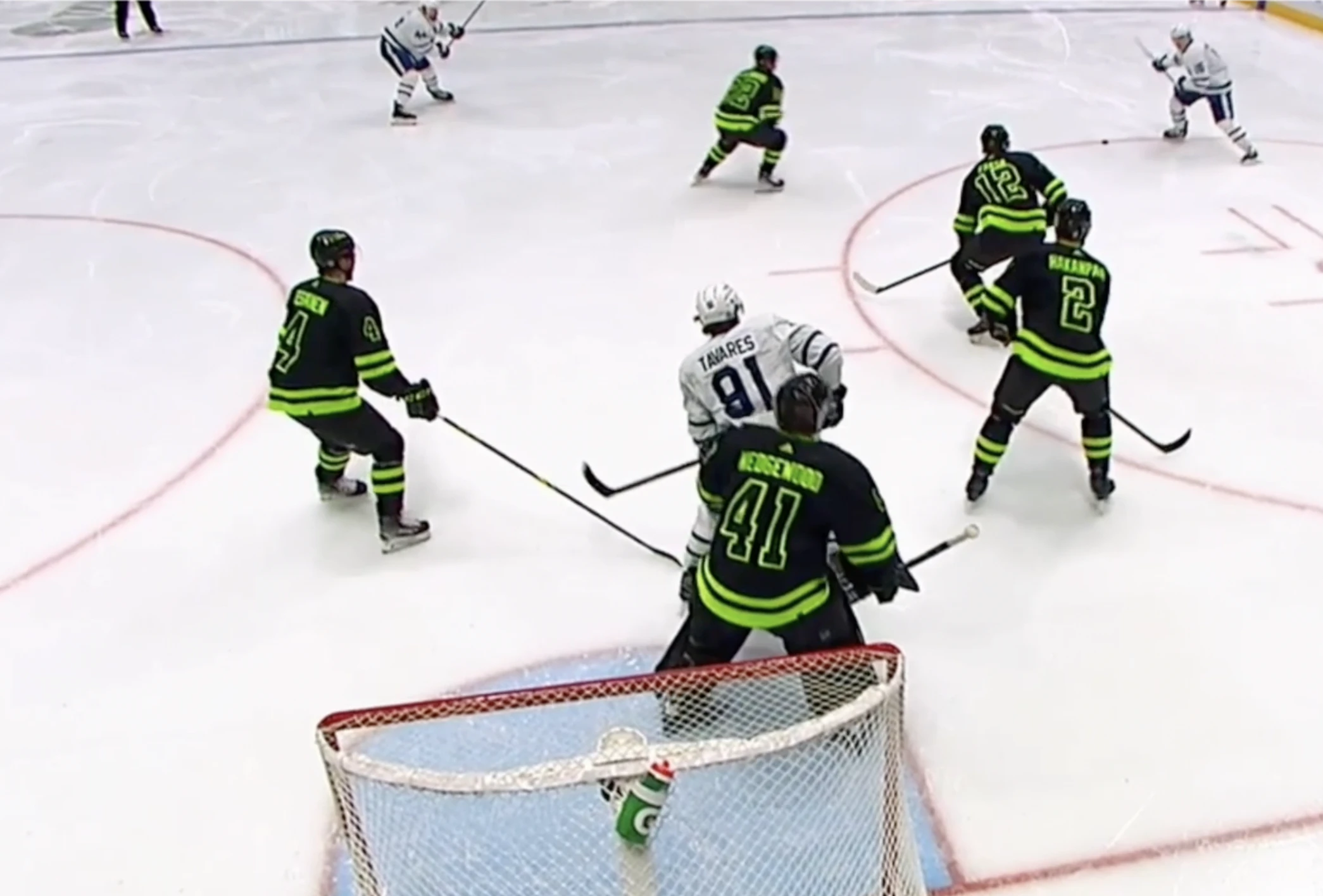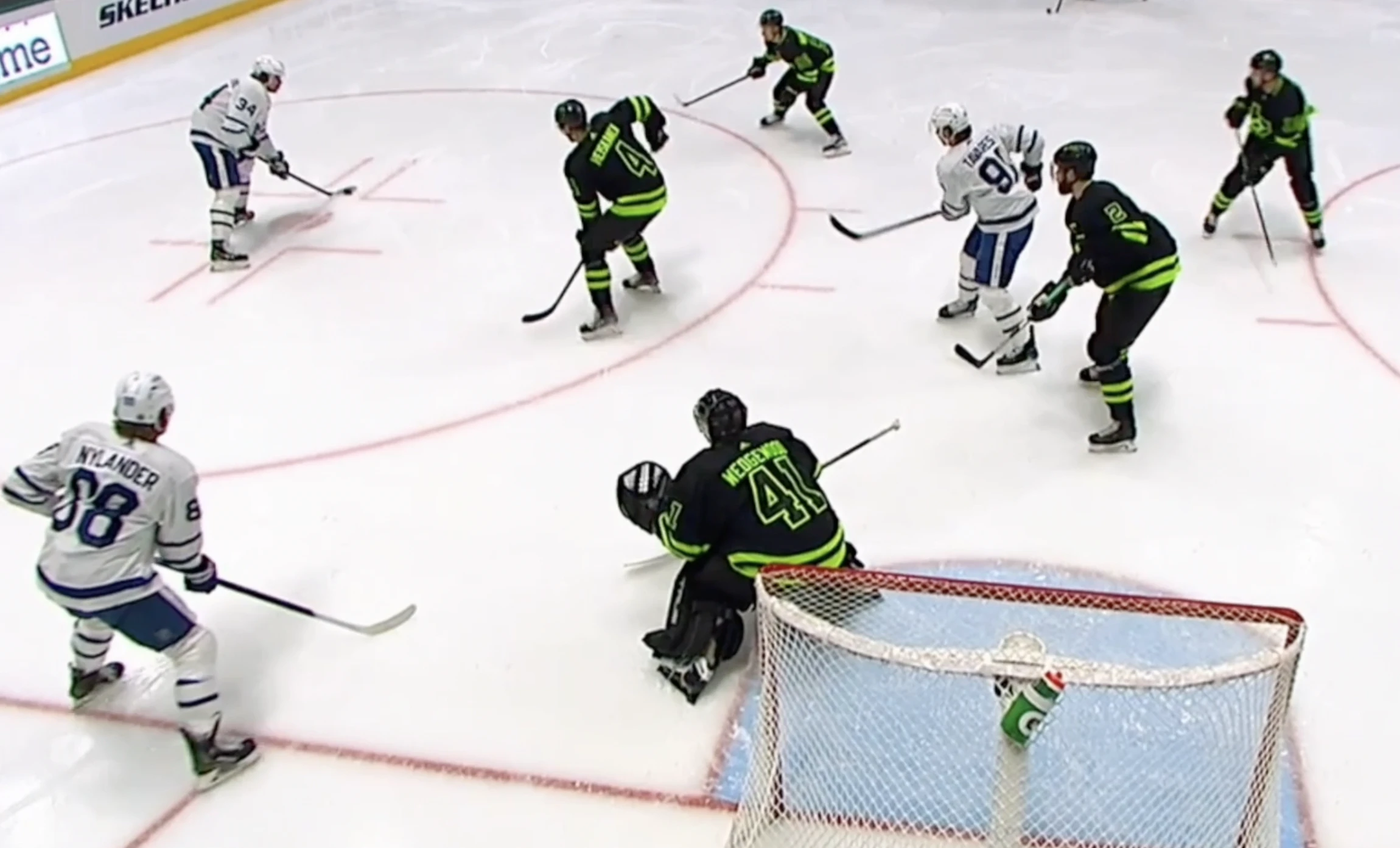 With two visible pass options for Marner in Morgan Reilly winding up for a one-timer up high and John Tavares presenting his stick for a tip in front, plus Matthews lurking off screen to his left, what do you make of Wedgewood narrowing up his stance? Can you see why he would?