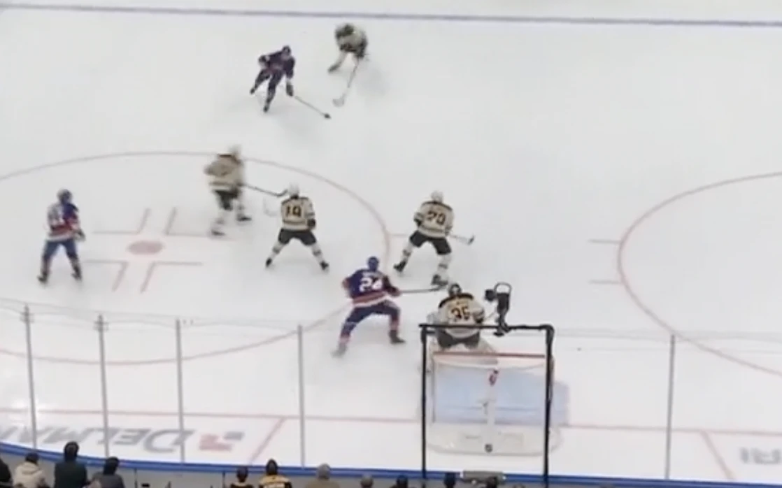 After walking us through breakaway chances in his first two Pro Reads, this time Ullmark is facing what starts as a rush chance against the New York Islanders but becomes more of a settled in-zone play when the puck is moved back up to a shooter atop the faceoff circle: