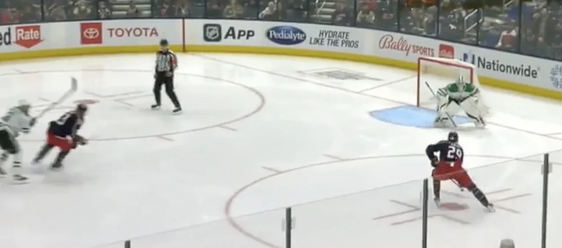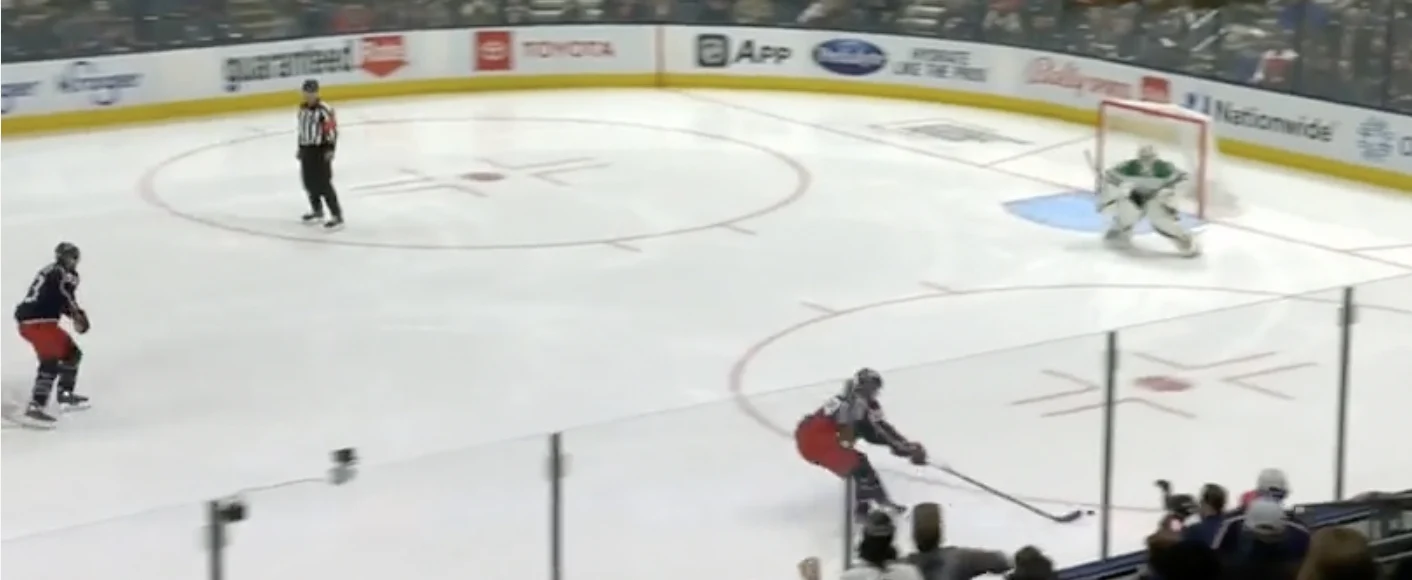 After more of a straight-on breakaway last time, Holtby is facing a potential 2-on-0 against the Columbus Blue Jackets this time, with Patrik Laine cutting in on more of an angle: