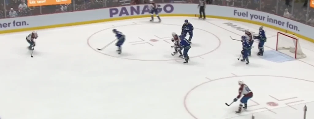This time Delia is facing a loaded Colorado Avalanche power play that has just worked the puck low-to-high to defenseman Cale Makar, who has time to skate downhill with a shooting lane through a layered screen, as well as pass options on either side.