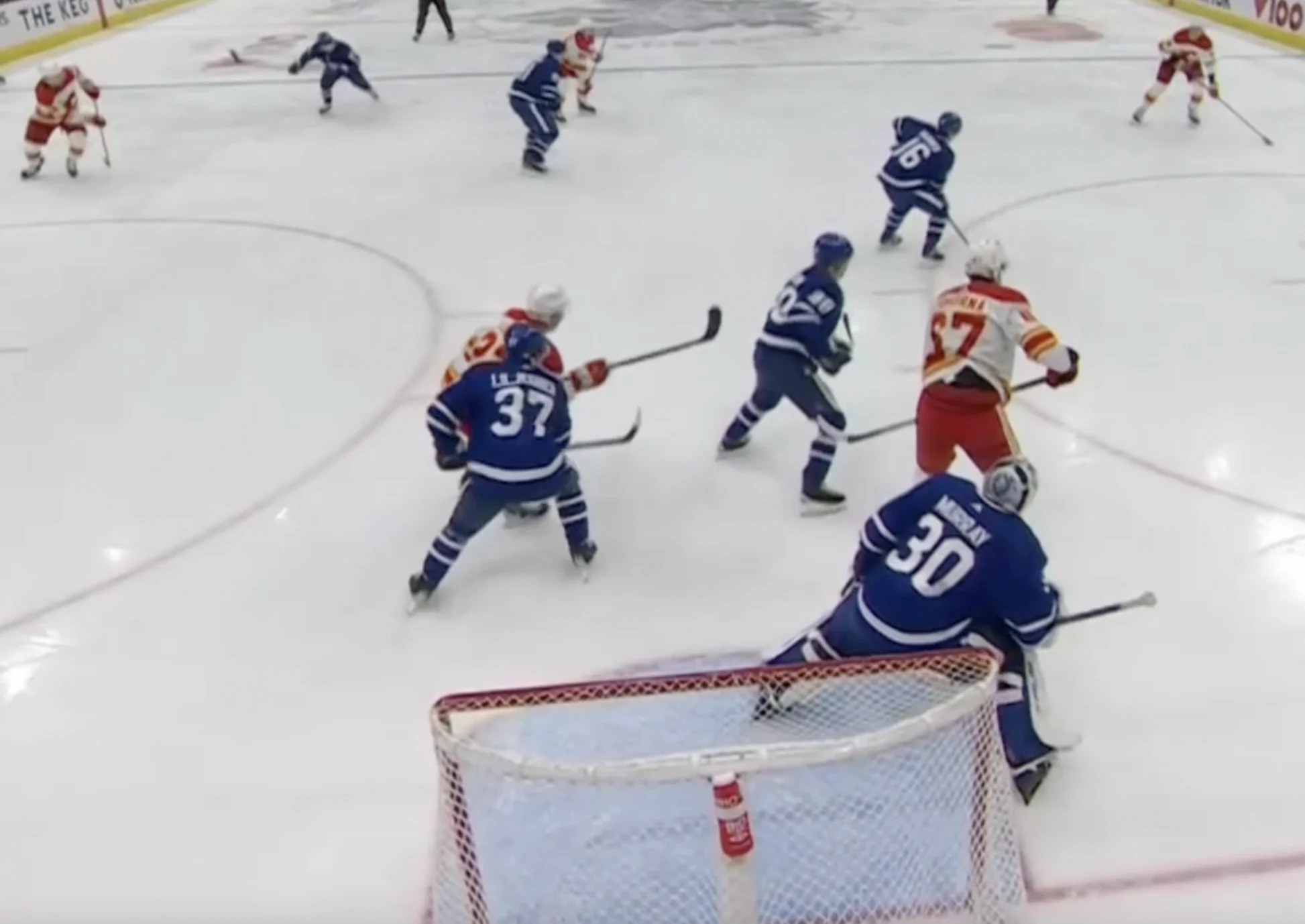Murray is facing a screen chance during 5-on-5 play against the Calgary Flames in his Pro Reads debut, after his Toronto Maple Leafs turned the puck over trying to exit the defensive zone:
