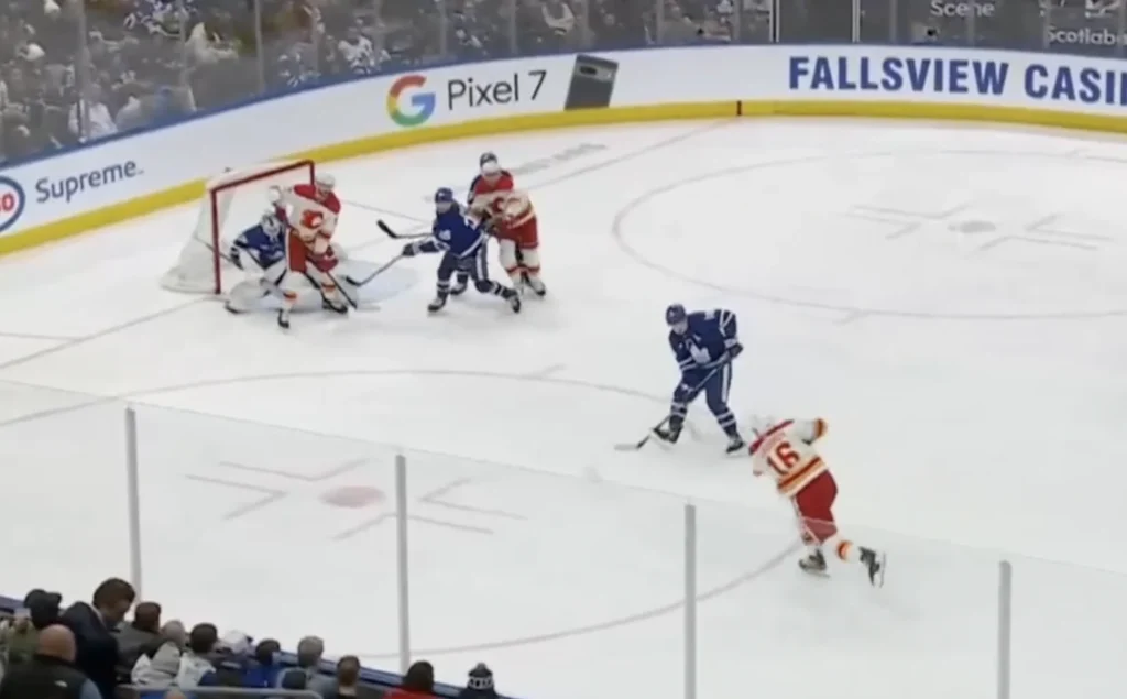 The behind-the-net replay gives us a great perspective on what Murray is dealing with as Flames defenseman Nikita Zadorov skates into the top of the face-off circle unchecked in the freeze frame above. At this point, what do you make of Murray’s positioning? What reasons can you see that he would choose to look around the screen on the short side like this?