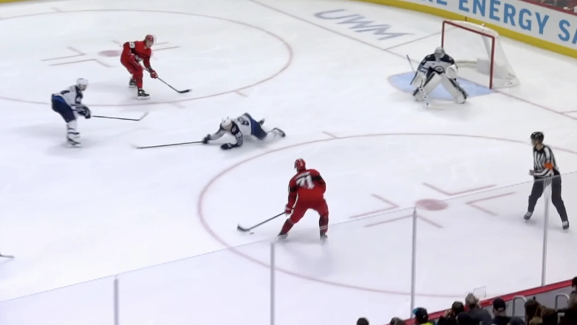 This time Hellebuyck is facing a 2-on-1 against the Detroit Red Wings, with captain Dylan Larkin leading the rush as it comes over the Winnipeg blue line: