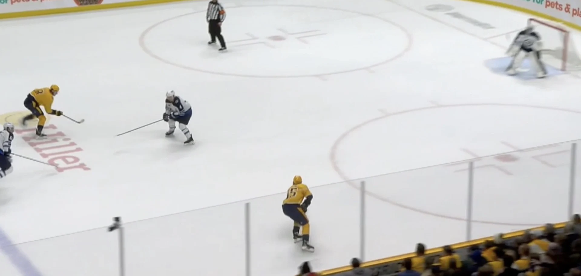 This time Hellebuyck is facing a 2-on-1 rush against the Nashville Predators, with Matt Duchene carrying the puck into the zone and a passing option to his left: