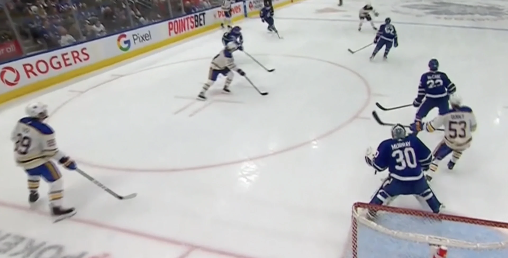 Murray is facing a Buffalo Sabres power play this time, with defenseman Rasmus Dahlin winding up from the point, traffic in the lane and high-tip and passing options to Murray’s left: