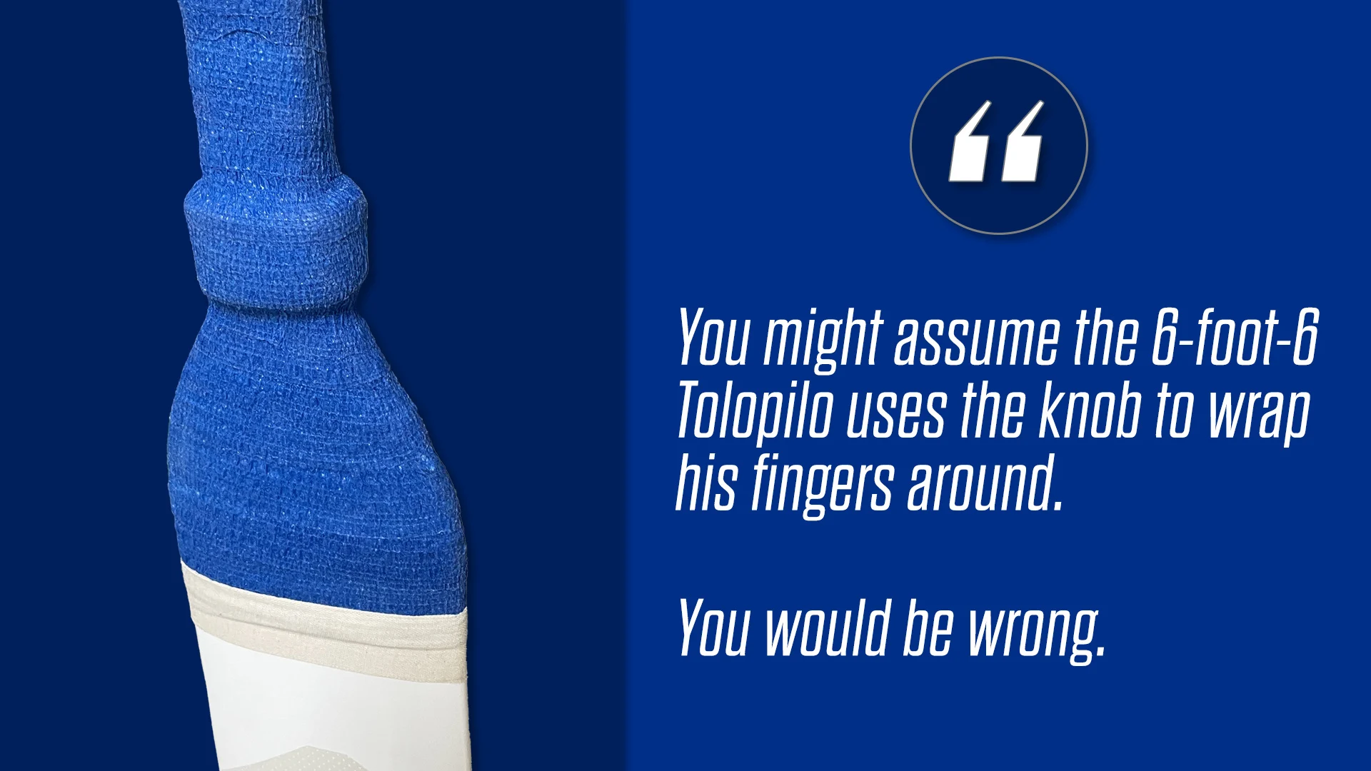 Using a combination of standard stick and grip tape, Tolopilo creates a knob at the top of the shoulder of his Warrior stick, where it connects to the shaft. At first blush, you might assume the 6-foot-6 Tolopilo uses the knob to wrap his fingers around. You would be wrong.