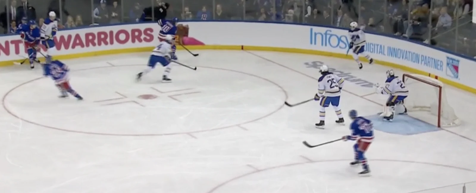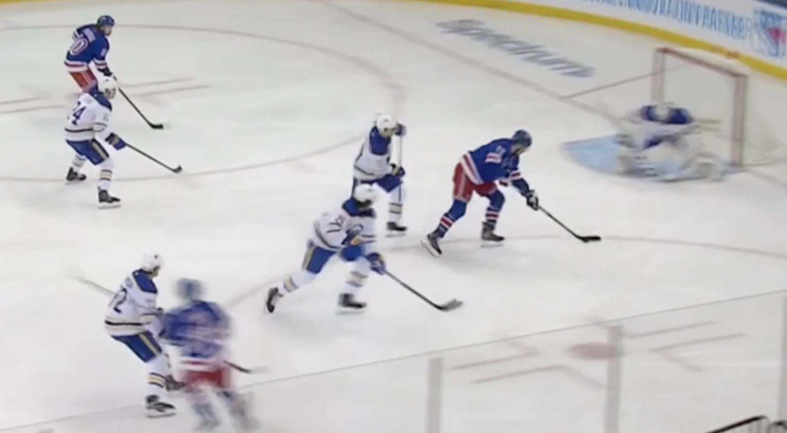 This sequence starts as a slight 3-on-2 at the Buffalo blue line against the New York Rangers but a nice pass to the middle net drive player leaves Levi facing a tough chance in tight: