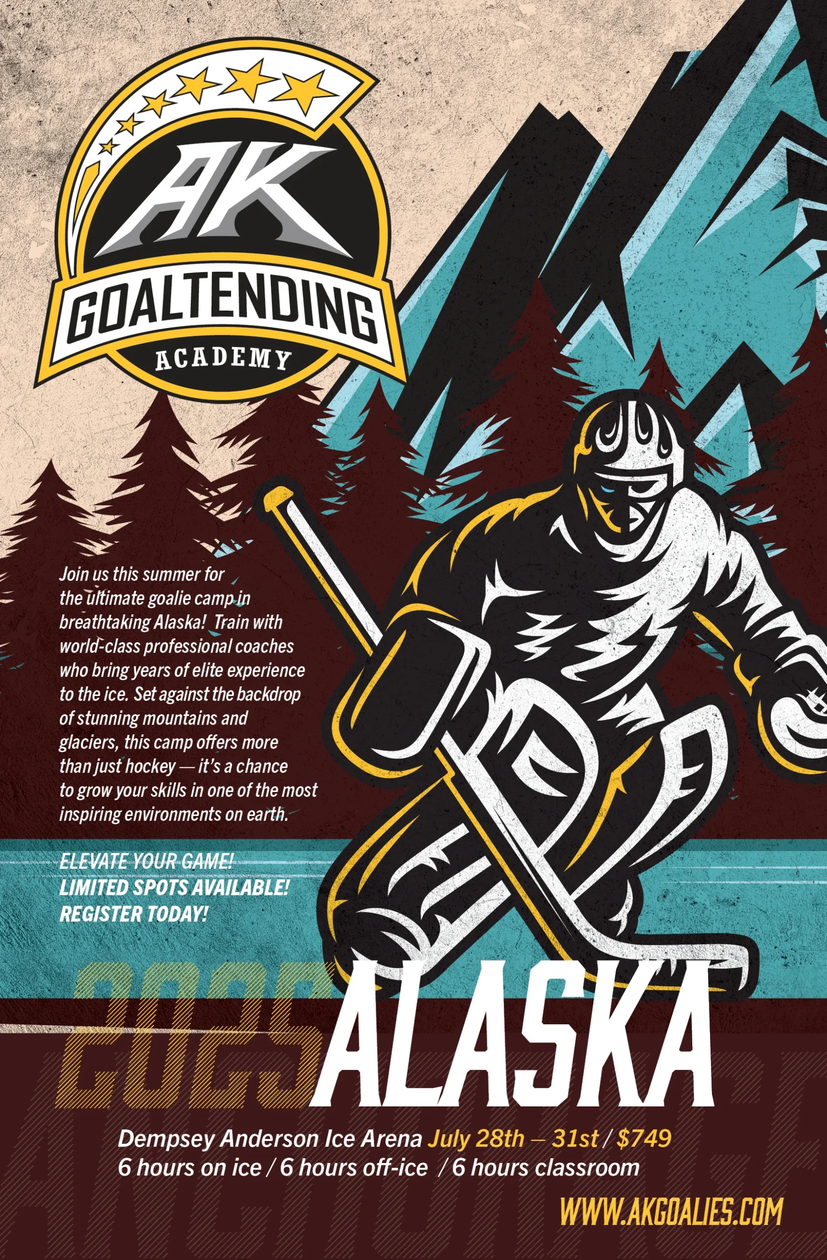 Alaska Goaltending Academy was started in 2016 to provide world class training to goaltenders of all ages up in Alaska. The academy was started by Steve Thompson who is now the Manager of Goaltending Development for all of USA Hockey. The program's structure is built upon Steve's years of experience coaching at the college, professional, and international levels. In addition to the local leadership, AKGA also brings up a guest coach from the games highest levels including in 2024 Thomas Speer from the San Jose Sharks and in 2023 Matt Millar from the LA Kings. This year Rob Couturier, who works as a goalie coach within the Seattle Kraken farm system will be joining AKGA for the summer. Notable alums of AKGA include Jeremy Swayman with the Boston Bruins, Phoenix Copely with the LA Kings, and Isaiah Saville with the Las Vegas Golden Knights. If you are looking for incredible development in one of the most majestic areas of the world, sign up today while spots are still available!